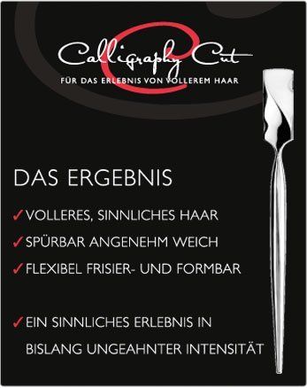 Der Schnitt mit dem Calligraphen gibt feinem Haar Volumen, Elastizität und Flexibilität; das Haar lässt sich einfach stylen – dafür steht der Calligraphy Cut.
